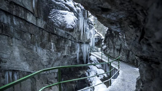 Rote Route: Von der Kasse am Parkplatz P 1 wandern Sie auf geräumt und gestreutem Weg zum oberen Ende der Schlucht bis zur Kontrollstelle. Dabei kommen Sie auch am berühmten mehr oder weniger stark mit Eiszapfen bewachsenen majestätischen Eisvorhang vorbei. Wie in einem Eisschloss kann man sich fühlen.