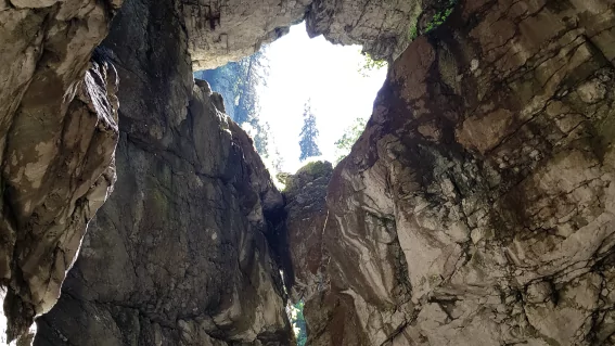 Im Bereich der oberen Kasse / Kontrollstelle befindet sich eine Informationstafel, die auch die Ausbruchstelle des großen Felssturzes aufzeigt.