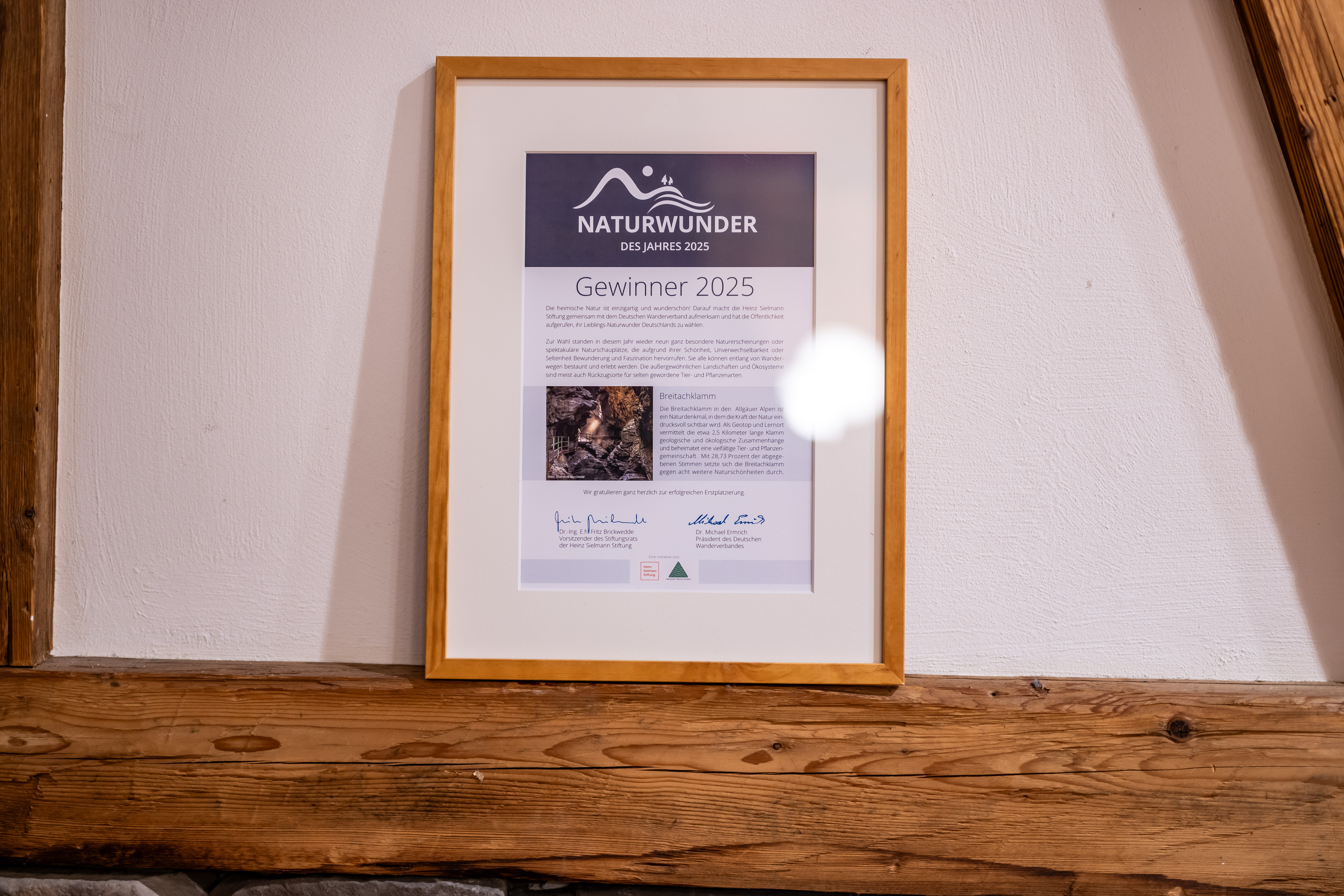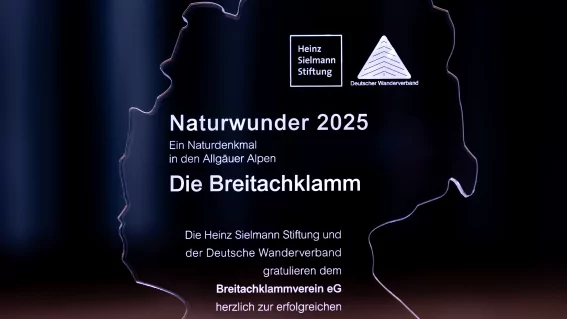 Im Frühjahr 2025 wurden die Bewerbungsunterlagen der Breitachklammverein eG bei der Heinz Sielmann Stiftung und dem Deutschen Wanderverband eingereicht - die Jury wurde überzeugt und so stand die Breitachklamm als eines von neun Finalisten in die Wahl gehen.